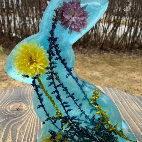 Käsintehty pääsiäispupu/koristepupu. Vaaleanpunainen pupuhahmo, jonka sylissä on pieni kuppi tai kolo esimerkiksi pienen esineen tai koristeen asettamiseen. Saatavilla on myös muita koristeellisia pääsiäisen pupuja. #pääsiäinen #käsintehty
