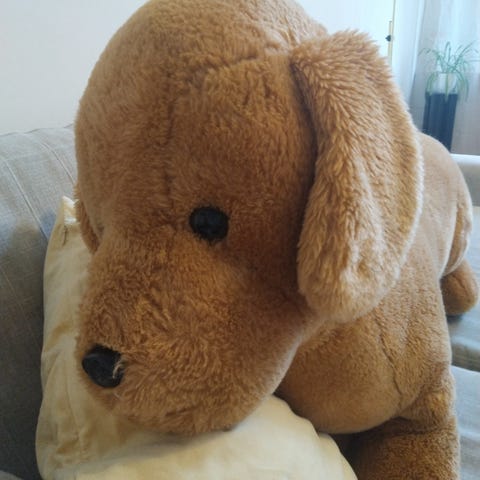 Leluksi, koristeeksi, kunnostettavaksi. Mitat 57 x 24 x 24 cm. Yksi korvista pitäisi ommella kiinni ja toinen silmä hukkunut matkan varrella. Voi olla 1970-luvulta, hyvin pehmeä tekoturkismainen kangas. Vaikka on monet vuosikymmenet ja leikit nähnyt, en löytänyt isompaa repeämää josta vuotaisi mitään sisälmyksiä. Mahdollisesti täytetty jollain säkkituolin täyttöön tarkoitetulla materiaalilla.