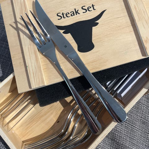 Hei:)! Myynissä vinga nettisivuston käyttämöttömät pihvi atermet. Veitsissä muovinen on suoja eli se sopii mainiosti pihvin leikkaamiseen. Tuote on paketissa, ja pyytäisin tuotteesta 30€.