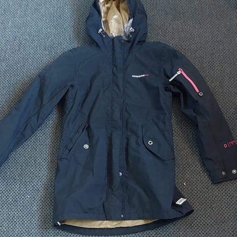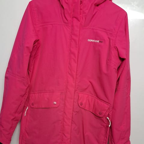 Didriksons naisten takki, koko 38. Väri valkoinen. Materiaali polyesteriä. Takissa on kiinteä huppu, täyspitkä vetoketju edessä sekä vetoketjulliset sivutaskut. Hihansuissa on tarrakiristykset. Sisäpuolella verkkovuori ja tasku. Sopii arki- ja ulkoilukäyttöön.