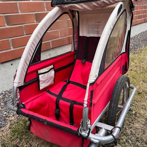 Kaksipaikkainen polkupyörän peräkärry. Kärryssä on vetopuomi polkupyörään kiinnittämistä varten sekä kaksi istuinpaikkaa turvavöillä. Toisen istuimen toinen vyö kuitenkin puuttuu, eli vain yhden lapsen kärry jos köyttää haluaa. Sivulla on suuret ikkunat ja edessä läpinäkyvä sadesuoja, joka suojaa lasta tuulelta ja roiskeilta. Suuret ilmakumirenkaat parantavat ajomukavuutta ja vakautta. Elämää nähnyt kärry, täysin toimiva kuitenkin. Painettavissa näppärästi kasaan. Pyörään kiinnitettävä vastinkappale sisältyy hintaan.