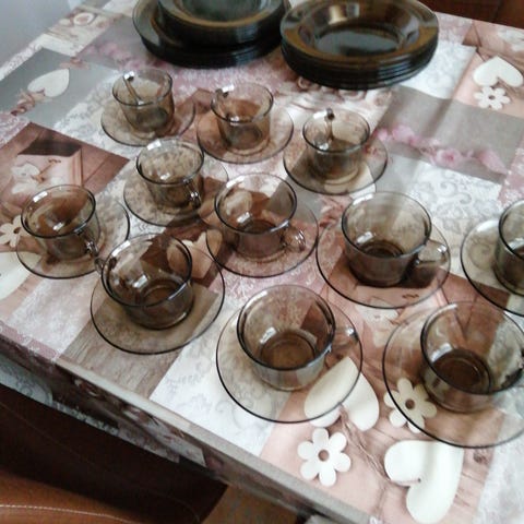 Arcoroc lasiastiasarja, johon kuuluu ruskeasta lasista valmistettuja teekuppeja aluslautasineen sekä matalia ja syviä lautasia. Astiat ovat läpikuultavaa ruskeaa lasia. Soveltuu esimerkiksi kattaukseen kahvi- ja teehetkiin sekäsis. 4 pullalautasta. 5 matalaa ruokalautasta 6 syvää lautasta sekä kahvikuppeja tasseineen ruoka-annosten tarjoiluun.