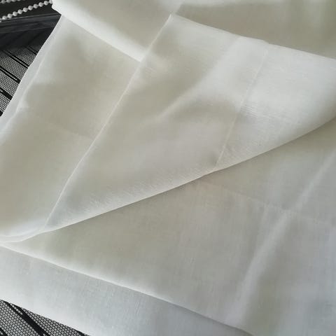 Laadukas, laskeutuva kangas. Sopii kapeaan tankoon, nipsuihin, koukkuihin, tarvittaessa voin ommella ns. siimanauhan/rypytysnauhan taakse, jolloin menee myös paksuun tankoon. Lisää pituutta max. 18 cm saa 3-kertaisesta alakäänteestä, voin lyhentää ja pidentää tarvittaessa.