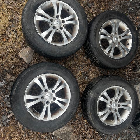 Renkaat ovat hyvässä kunnossa, normaalisti käytetyt, ilman näkyviä vaurioita. Alumiinivanteissa on pientä käytön jälkeä, mutta yleisilme on siisti.