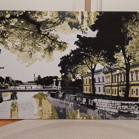 Styroxlevylle pinnoitettu Vallilan Bergen kangas tauluksi. 120x60cm