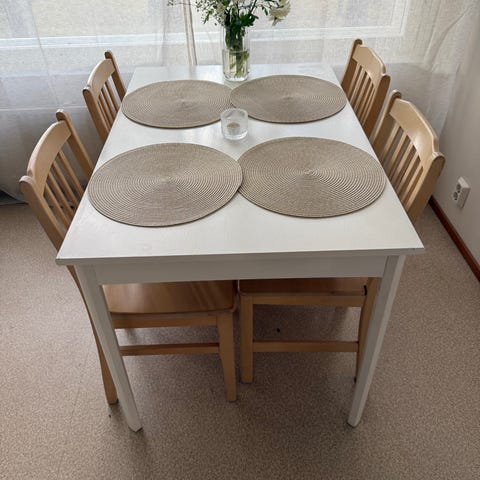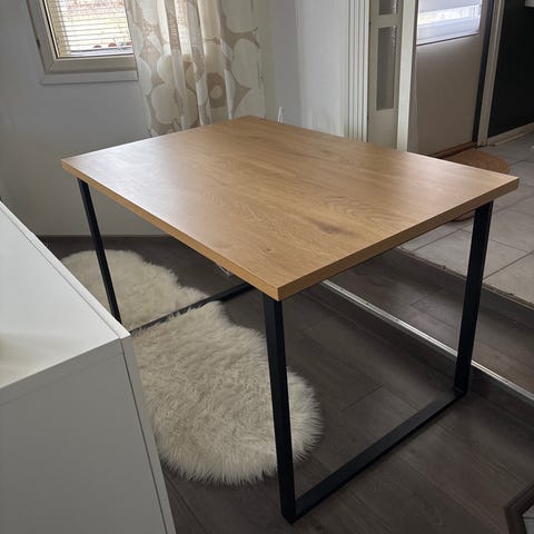 Maskun ruokapöytä 70cm x70cm. Mustat reunat ja jalat ja päältä vaalean puun sävyinen.