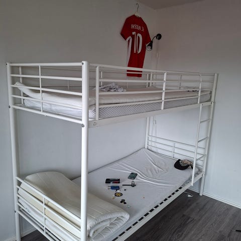 Veken Liisa pieni kerrossänky, 70x155 cm. Ollut käytössä sekä kerrossänkynä että erillisinä sänkyinä. Alalaatikko ja rappuset mukana. Toisen sängyn laitaan on oman elämänsä majava testaillut purukalustoaan, näkyy viimeisessä kuvassa.