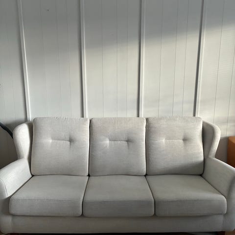 Vaaleanharmaa ja mustat jalat. Jyskin orevad vuodesohva. Leveys levitettynä 120cm ja pituus 198cm. Istuinsyvyys 61cm ja istuinkorkeus 41cm.