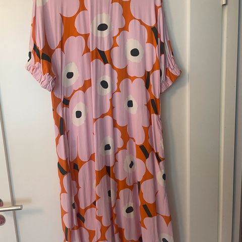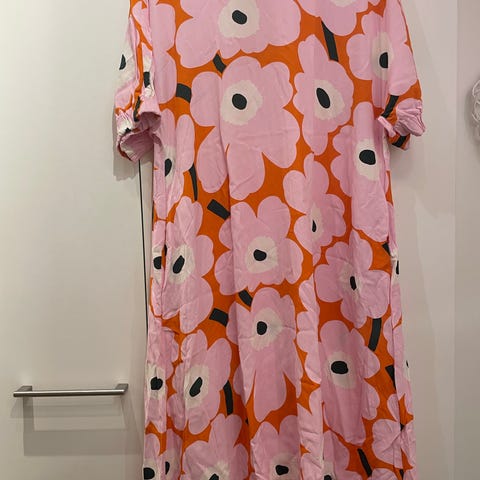 Marimekko Vokaali Unikko -mekko, koko 38. Malli on väljä, polven alapuolelle ulottuva, lyhyillä hihoilla, joissa on rypytys.