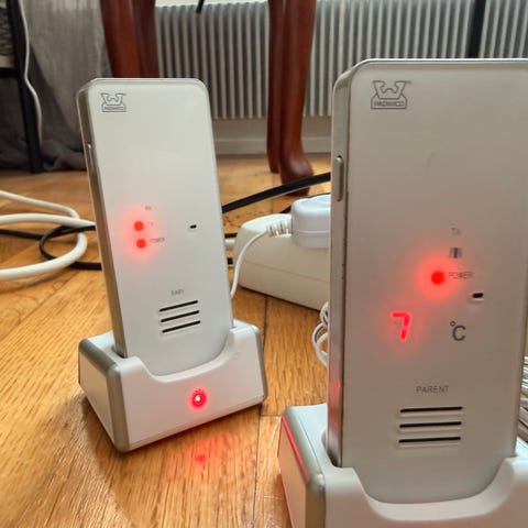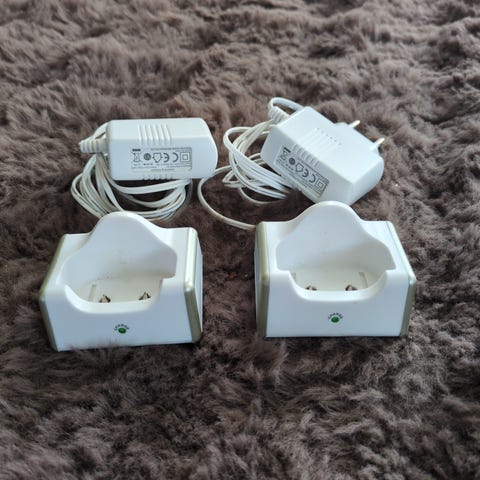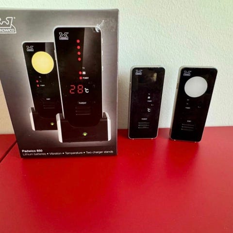 Valkoiset padwico itkuhälyttimet ja laturit. Lämpötila, värinä ja yövalotoiminto. Toisessa pieni halkeama, ei vaikuta käyttöön. Näkyy kuvassa