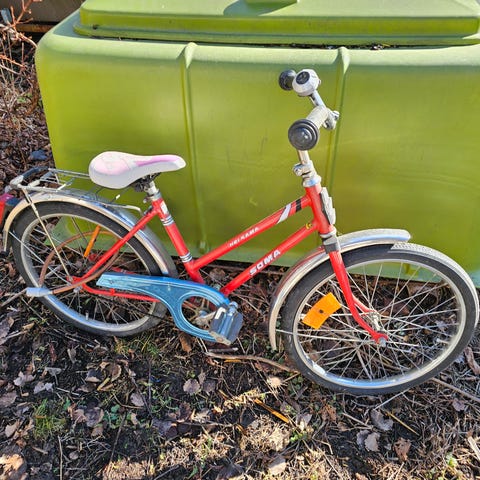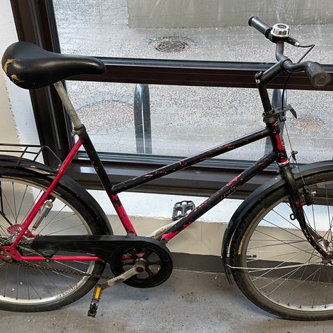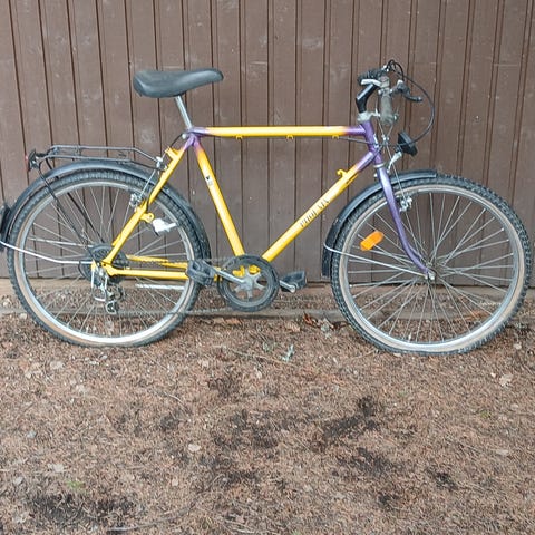 Ihanan värinen pyörä on ollut käytössä paljon, mutta on silti hyvässä kunnossa, vaikka jarruttaessa pyörä välillä vähän ääntelee. Runko on hieman ruostunut ja vaihdetaulun numeroita ei näy. Pyörässä on 7 vaihdetta. Myyn koska meille käynyt jo liian pieneksi