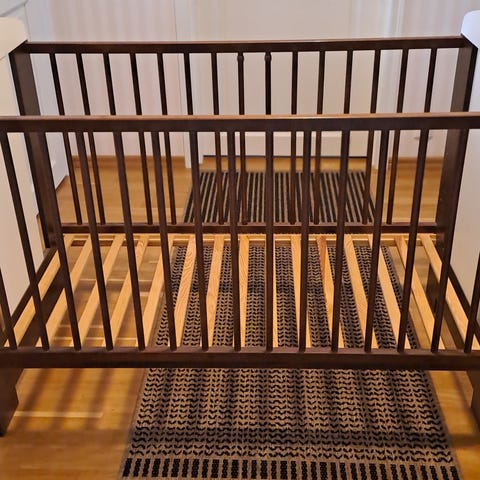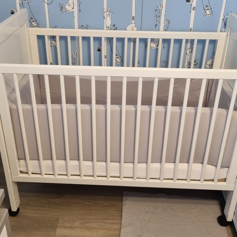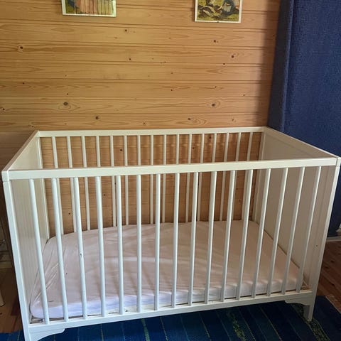 Pinnasänky, väri valkoinen. Sängyssä on pinnalaita ja toinen puoli umpinainen seinämä ja rei’itetty pohjalevy. Perus pinnasängyn mitat. Nouto Savitaipaleelta