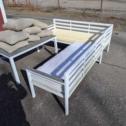 Metallinen penkki. Raksa käytössä ollut siksi pinnassa laastijämiä. Muuten suora runkoinen.