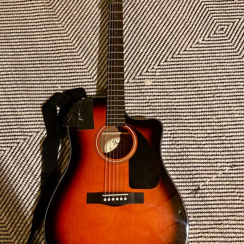 Siisti akustinen kitara. Sopii hyvin aloittelijalle ja soittaneellekin. Kiiltävä pinta ja väri tumma puu. Metalliset kielet. Ei virheitä kitarassa. Mahdollisesti kantolaukku mukaan.