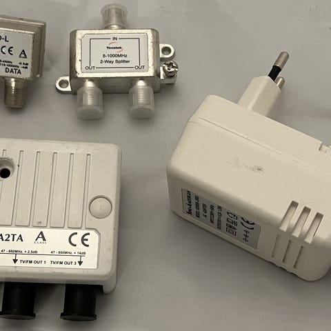 Kuvan Nedis kaapeli-tv ja data jakaja. Kaapelit suorana ja kulmaliittimillä.