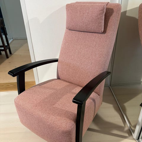 Kukkakuvioitu raidallinen nojatuoli. Istuinosassa ja selkänojassa on mustavalkoinen pystyraita ja suuret kukkakuviot. Tuolissa on pyöreä istuinosa ja matala selkänoja. Sopii esimerkiksi olohuoneeseen tai vapaa-ajan tilaan istuimeksi.
