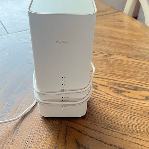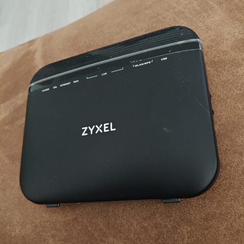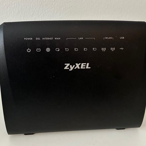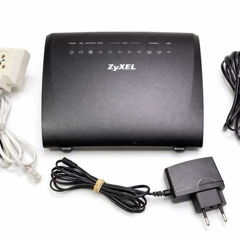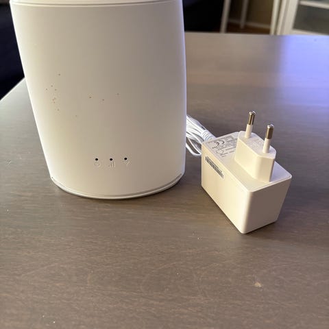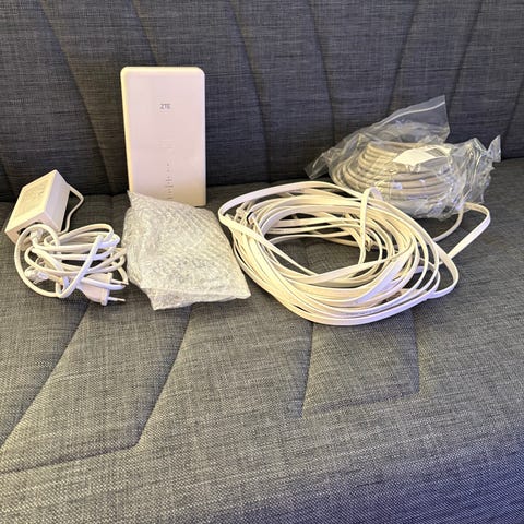 Modeemit-tyyppinen reititin valkoisena. Laitteessa on pystymallinen kotelo, etupaneelissa merkkivalot ja virtapainike. Mukana virtalähde ja kaapeleita liitäntöjä varten. Soveltuu kodin tai pienen toimiston verkkoyhteyden jakamiseen. Tarkemmat tekniset tiedot, kuten yhteystyyppi ja nopeus, eivät käy ilmi kuvista.