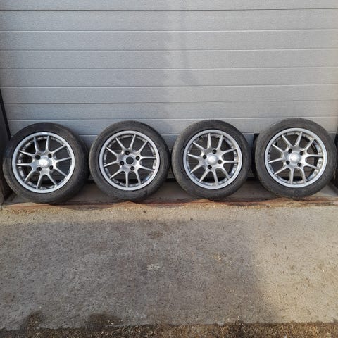 Kesärenkaat alumiinivanteilla. Pintaa n. 3mm. ET40. 7J. Keskireikä alkuperäinen koko 67.1mm, soviterengas kiinni 64.1mm