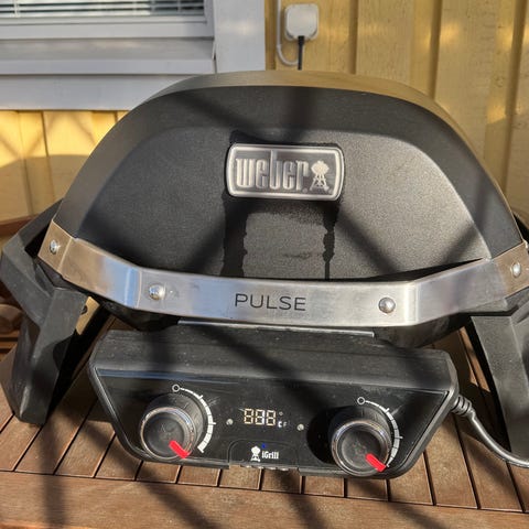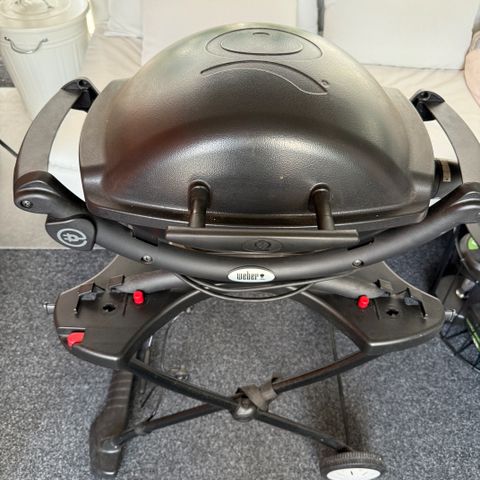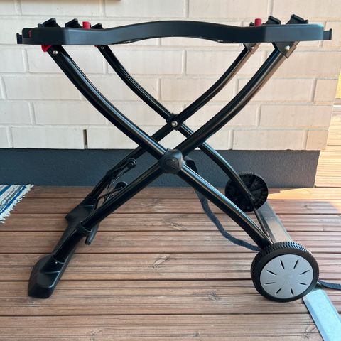 Weber Q -sarjan sähkögrillin jalusta (esim. Q1400). Jalusta tuo joustavuutta grillin sijoittamiseen ja mahdollistaa sopivan työskentelykorkeuden. Materiaalina kestävä muovi/metallirakenne, etupaneelissa Weber-logo.