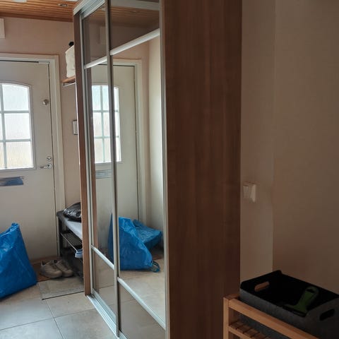 Valkoisella kehyksillä peiliovet. Ovien koko: 49cmx173cm, näitä kaksi. Kiskon pituus 95cm.