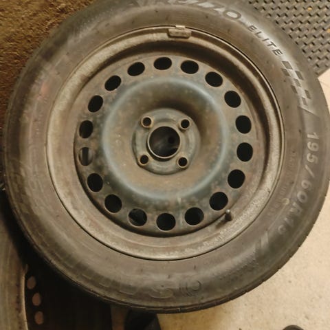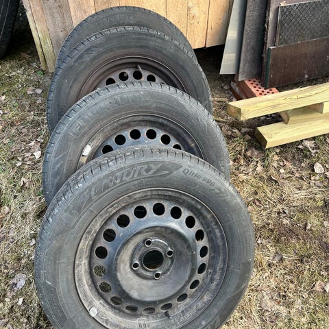 Kevät siivouksen yhteydessä pihalta myyntiin kasa Opel Astra G 2003 autossa olleita kesä ja talvitärenkaita peltivanteilla.