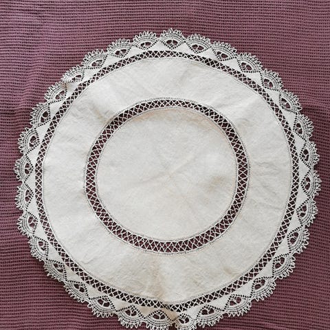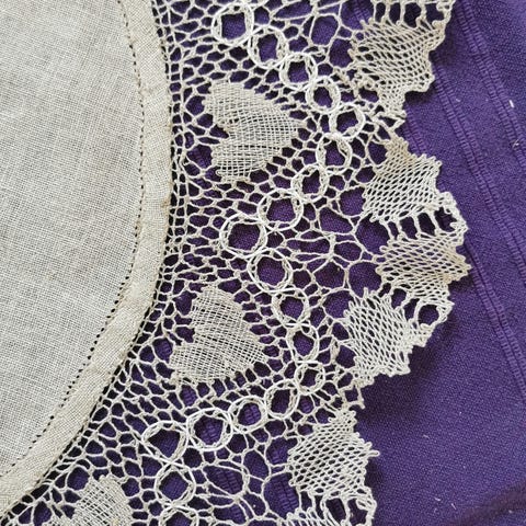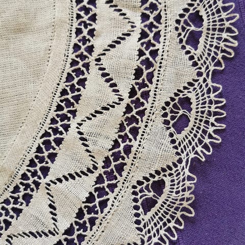 Käsin huolitellut reunat. Jonkin verran muutamassa kohdin ohuemmalta kangasta/kudontaa, mutta superkaunis kokonaisuus.