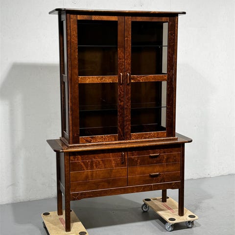 Vitriinikaappi, jossa on lasiovet ja koristeelliset tassujalat. Kaapissa on neljä vetolaatikkoa ja kaksi lasitaso hyllyä.