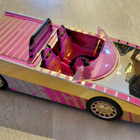 L.O.L. Surprise OMG lelukämppäauto, joka avautuu leikkisetiksi. Sisällä on erilaisia leikkitiloja, kuten istuimia, taso ja peilipöytätyylinen alue sekä säilytyspaikkoja pienille tarvikkeille ja nukeille.