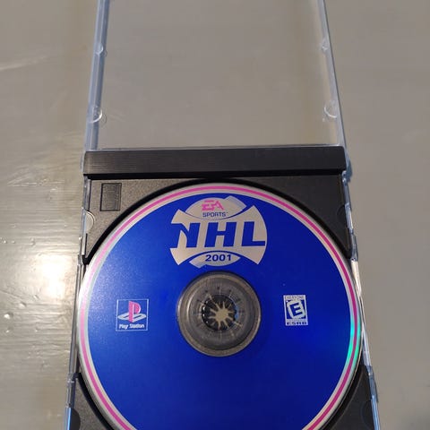 EA Sports NHL 2001 Playstation peli. Jääkiekkoaiheinen urheilupeli alkuperäisellä Playstation-konsolille. Pelissä on viralliset NHL-joukkueet ja -pelaajat kaudelta 2000–2001. Levy ja kotelo näkyvät kuvissa. Peli on tarkoitettu Playstation-konsolille (PS1).