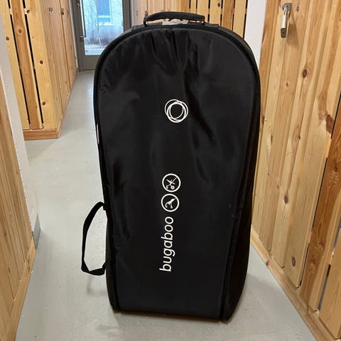 Bugaboo-matkarattaiden kuljetuslaukku. Laukussa on pyörät ja kantokahva, ja se pysyy itsekseen pystyssä. Tukeva ja pehmustettu laukku suojaa rattaita lialta ja kolhuilta esimerkiksi lentokoneen ruumassa tai varastossa. Laukku on moitteettomassa kunnossa.