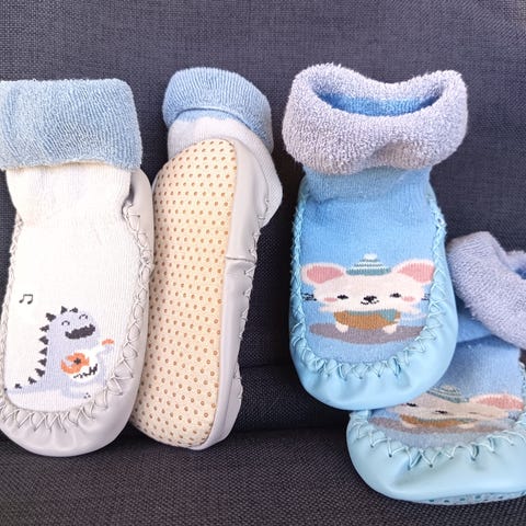 Puin nämä lapselle, kun hän ei vielä osannut kävellä emmekä olleet ottaneet mitään kenkiä käyttöön. Kuratossut olivat kätevät sadesäässä ja kun lapsi halusi seisoskella, ryömiä ja touhuta esim. hiekkalaatikolla tai märässä, hiekkaisessa tai kuraisessa maassa.