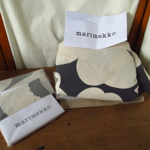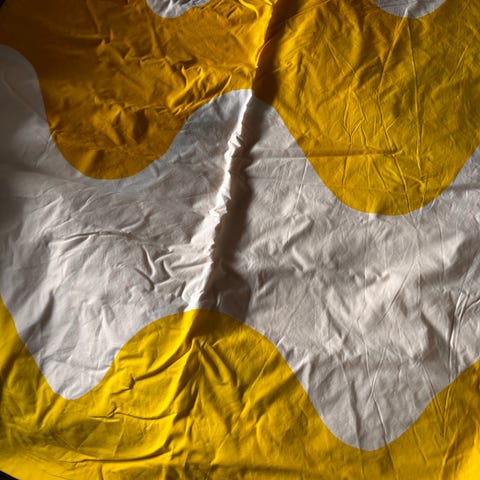 Marimekko pussilakana keltavalkoisella kuviolla. 2x pussilakana ja 2x tyynyliina. Vähän käytettyt. Yhdessä tyynyliinassa jotain mustia läikkiä, ovat kajal-jälkiä, lähtisivät varmaan esim vanisilla. En ole kokeillut. Säilytyksen jäljiltä ruttuiset. Väri ei ihan noin tummakeltainen. Yhteishinta