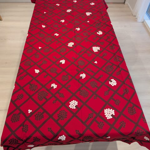 Marimekon vähällä käytöllä ollut pöytäliina vuodelta 2004. Mitat 205cm x 140cm.