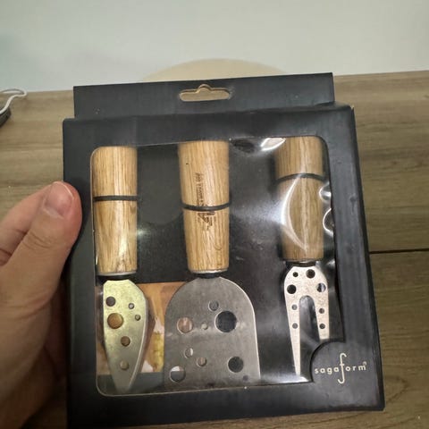 Sagaform juustoveitsisetti sisältää kolme erilaista juustoveistä/juustotyökalua. Terät ovat metallia ja niissä on rei’itetty muotoilu. Kahvat ovat keltaista muovia. Olleet vuosia käyttämättä, mutta joskus muinoin on käytetty kyllä. Nouto arkisin 8 ja 16 välillä Kumpulasta tai iltaisin / viikonloppuisin Malminkartanosta.