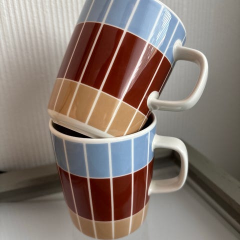 Marimekko tiiliskivi mukit 2,5 dl. Hinta yhteensä kahdesta mukista 20 eur.