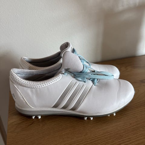 Adidas golfkengät, koko 36 2/3. Väri musta valkoisilla raidoilla. Nauhakiinnitys ja nappulapohja, joka on suunniteltu pitämään paremmin kiinni nurmella. Päällinen synteettistä materiaalia ja tekstiiliä, kantapäässä Adidas-logo.