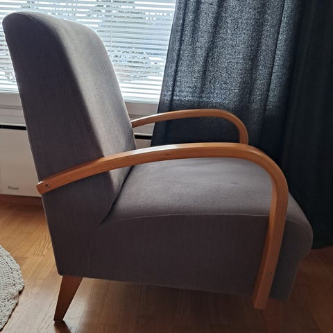 Pari vuotta vanha, erittäin vähän istuttu Nanna nojatuoli. Väri tumman harmaa, käsinojat mustat.