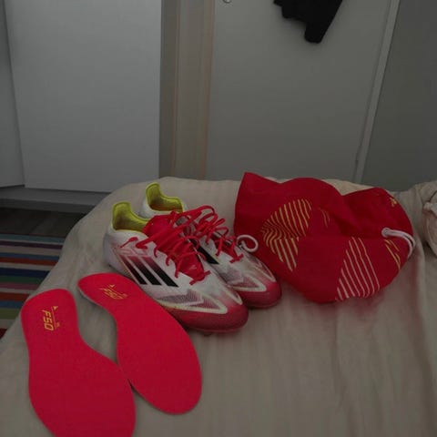 Adidas F50 jalkapallokengät. Monivärinen malli, jossa sinisen, pinkin ja neonkeltaisen sävyjä. Kengissä on nappulapohja, joka on suunniteltu jalkapallon pelaamiseen nurmikentillä. Koko 42 2/3
