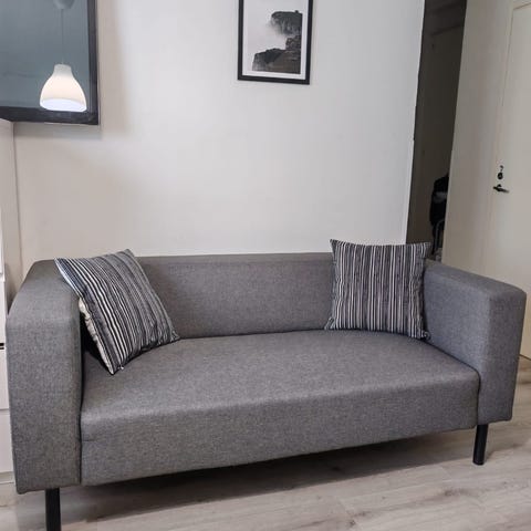 Hinta taisi olla kuljetuksineen Kuopion Ikeasta himpun alle 600 euroa. Vaikka on kahden hengen sohva niin hyvin on mahtunut 3-4 ihmistä istumaan.
