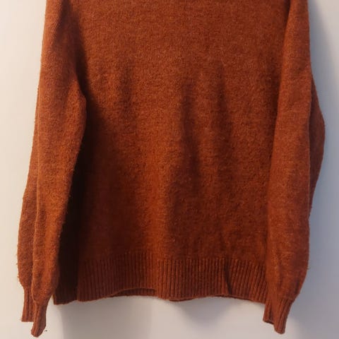Nanso karamelli neule. Koko L. Harmaa, V-pääntie ja pitkät hihat, joissa resorimaiset hihansuut.