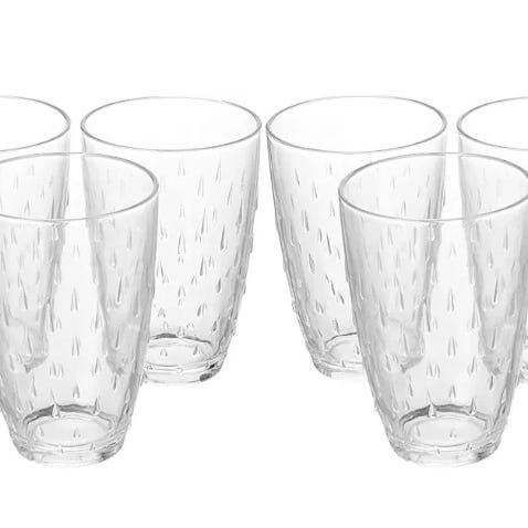 Moniväriset juomalasit, yhteensä 6 kappaletta. Laseissa on läpikuultavat, eri väriset pinnat ja fasettimainen kuviointi. Soveltuvat arki- ja juhlakäyttöön juomien tarjoiluun. MMM