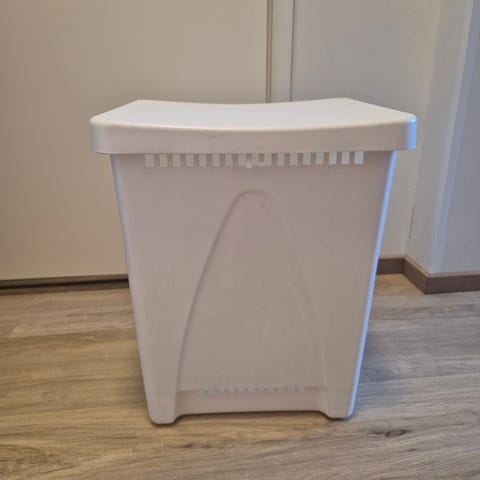 Valkoinen Ikean pyykkikaappi, jossa ovessa kaksi pyöreää aukkoa. Sisällä on kaksi pyykkilokeroa. Ylhäällä hylly.