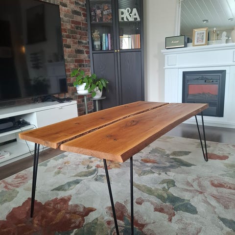 Käsityönä tehty sohvapöytä. Petsattu tammen väriseksi. Muuta käytönjälkeä ei oikeastaan ole, kuin kannessa pieni jälki josta petsi on kulunut.