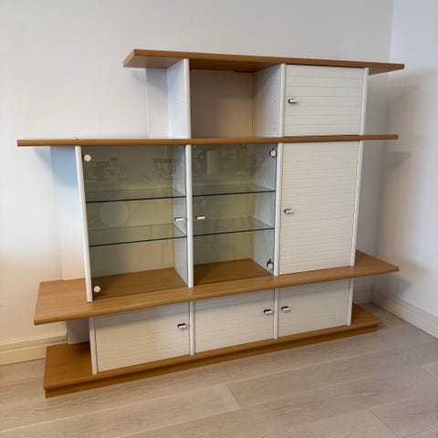 Kaksi avohyllyä ja kaksi umpihyllyä joissa toisessa maitolasi. Kajdella hyllyllä valot.
