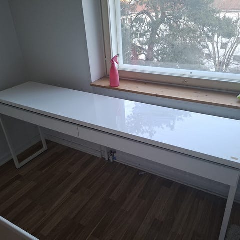 Valkoinen kapea työpöytä/meikkipöytä, jossa on kaksi pitkää vetolaatikkoa.