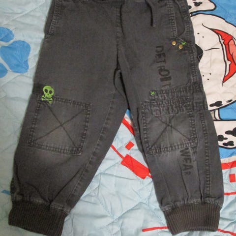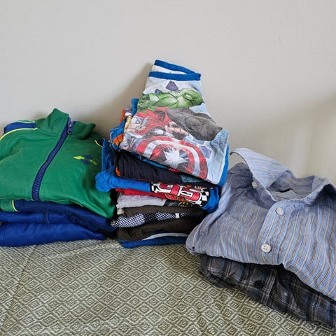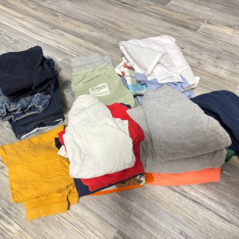 Yhdessä paidassa on pieni reikä, joka on korjattavissa. Muuten kaikki on ehjää. Farkut ovat kuin uudet!