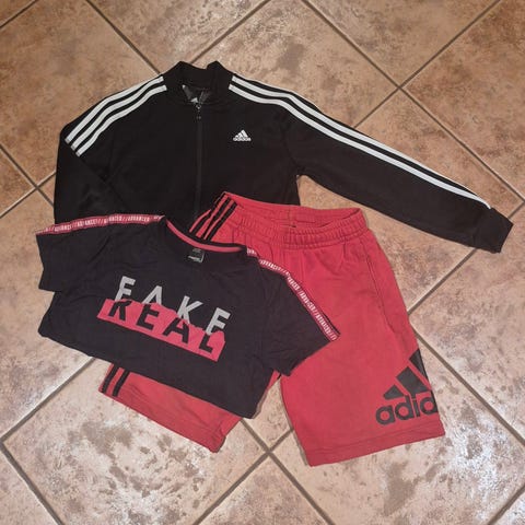 Pakettina tytölle: Adidas verkkapuku 152cm. Pinkissä takissa jonkunverran tummumaa, housuissa toisessa reidessä pintanaarmu. Siisti musta toppi 158cm. siistit mustat sortsit 164cm, siisti pitkä neuletakki 164cm ja siisti valkoinen croptop xs.
