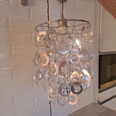 Halkaisija vähän alle 50cm. Neljällä lampulla. Kehä jotain muovia/kangasta ja alapuoli maitolasia jonka keskusta keltainen.