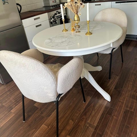 Myydään kaunis ja tukeva ruokapöytäryhmä, johon kuuluu pyöreä pöytä sekä 4 tuolia. Väri tyylikäs valkoinen/tammi, sopii monenlaiseen sisustukseen.