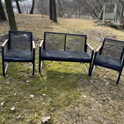 Terassikalustesetti, johon kuuluu suorakaiteen muotoinen pöytä ja neljä tuolia. Runko on metallia ja väriltään valkoinen. Pöydän kansi on suorakaiteen muotoinen ja soveltuu ulkokäyttöön esimerkiksi parvekkeelle tai terassille. Tuoleissa on käsinojat ja verkkokankaiset selkä- ja istuinosat, jotka tukevat istumista. Kalusteet on suunniteltu ulkokäyttöön ja tarjoavat istumapaikat neljälle hengelle. Setti sisältää kaksi pehmeää harmaata nojatuolin tyynyä.